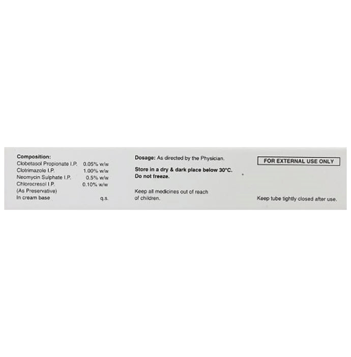 Composition : Clotrimazole (1% w/w) + Clobetasol (0.05% w/w) + Neomycin (0.5% w/w)