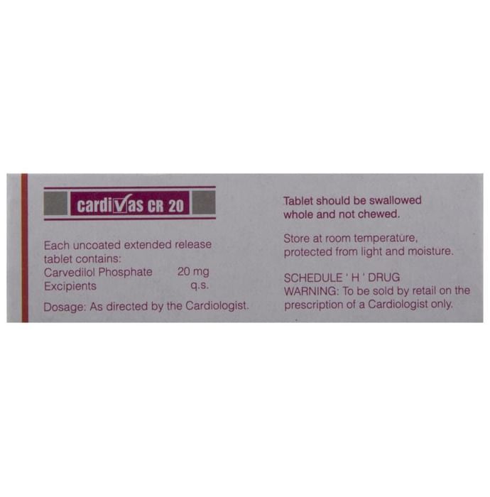 Cardivas CR 20 Tablet is a medicine used to treat high blood pressure, heart-related chest pain (angina), and heart failure. It works by relaxing the blood vessels, so blood can flow more easily to the heart. Lowering blood pressure also helps prevent future heart attacks and stroke. Cardivas CR 20 Tablet should be taken with food. You should take it in the dose and duration as advised by the doctor. It is important to take it even if you feel well or if your blood pressure is controlled. Do not stop this medicine without talking to the doctor as your condition could get worse.Making some changes in your lifestyle will help in improving your condition. These may include regular exercise, losing weight, smoking cessation, reducing alcohol intake, and reducing the amount of salt in your diet as advised by your doctor. This medicine is tolerated well by most patients but it may have a few side effects. These include dizziness, headache, breathlessness, and tiredness. Let your doctor know if these side effects bother you or do not go away.Before taking this medicine, let your doctor know if you have any heart or kidney diseases. Pregnant or breastfeeding mothers should also consult their doctor before taking this medicine.