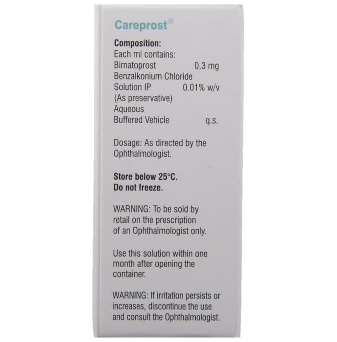 Careprost Eye Drop is a medicine used to reduce pressure in the eyes in adults with glaucoma and high pressure in the eye. If the pressure in your eye is too high it can damage your sight, potentially leading to blindness. It works by helping fluid flow from inside the eye into the blood. Careprost Eye Drop is suitable for adults and children and can be used by itself or in combination with other eye medicines to reduce pressure. Follow the instructions given by your doctor and use this medicine regularly to get the most benefit. If you stop using it, pressure in the eye could increase and damage your sight. Never use a bottle if the seal is broken before you use it for the first time. Make sure you remove contact lenses if you wear them and wait for at least 15 minutes before putting them back.The most common side effects of this medicine include conjunctival hyperemia and eye itching. If you get any side effects, talk to your doctor. They may be able to tell you ways of reducing or preventing some side effects or suggest another treatment. If your vision is blurred or you have other changes in sight for a time, do not drive until your vision is clear. This is usually a short term side effect.