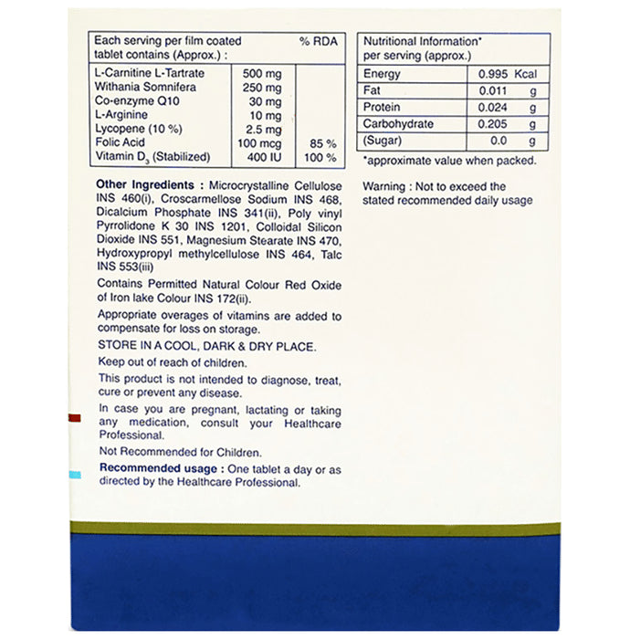 Composition : L-Carnitine, L-Tartrate. Withania Somnifera, Co-enzyme Q10, L-Arginine, Lycopene, Folic Acid & Viamin D