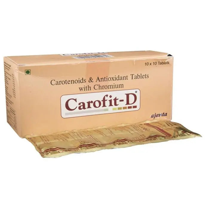 Carofit-D Tablet is a dietary supplement with Carotenoids, antioxidants, Cyanocobalamin, Folic acid and Chromium picolinate. It helps prevent nutritional deficiencies and soothes inflammation. The antioxidants help to reduce oxidative stress. The tablet helps in the growth and development of cells, boosts the immune system, balances vitamin content and metabolism of minerals, and helps maintain a healthy central nervous system. The tablets support eye health and may improve vision. Ingredients: Chromium picolinate, Vitamin C, Zinc sulphate, Folic acid, Cyanocobalamin, Carotenoids and micronutrients from carrot, Vitamin E acetate, Selenium dioxide, Thiamine mononitrate, Pyridoxine hydrochloride Benefits: The formulation helps to deal with low blood levels of folate (folate deficiency) and high blood levels of amino acid, homocysteine|Folic acid helps in the formation of red blood cells and prevents DNA changes|Pyridoxine is involved in protein, fat, and carbohydrate metabolism and red blood cells and neurotransmitter formation|Cyanocobalamin regulates body functions, such as cell multiplication, blood formation, and protein synthesis|Carotenoids help the body to regulate cell growth, regulate hormones and help enzymes to act as catalysts in metabolism|The tablet supports nervous system health and keeps the body energised|Chromium picolinate helps to move blood sugar (glucose) from the bloodstream into the cells to be used as energy and to turn fats, carbohydrates and proteins into energy Direction of use: Use as directed by the healthcare professional Uses: Protects the cells from damage|Boosts energy levels|Controls blood sugar levels|May improve eye health