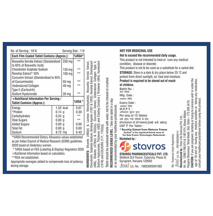 Composition : Boswellia Serrata Extract (Standardised to 65% Boswellic Acid) 250 mg,Chondroitin Sulphate Sodium 150 mg,Rosehip Extract 50% 100 mg,Curcumin Extract (Standardised to 95% Curcuminoids) 50 mg,Undenatured Collagen Type II (Carticol) 40 mg,Sodium Hyaluronate 30 mg,Other Ingredients: Binding Agents (1201 and 1202), Disintegrant Sodium Hyaluronate, Thickener (462) and Coating Contains Thickener (464), Humectant (468). Glidants (470() and 553(i))