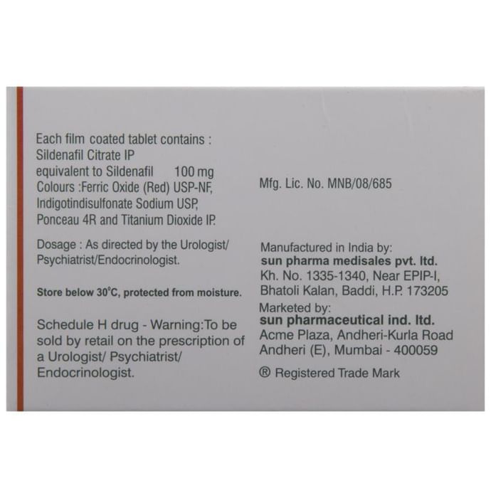 Caverta 100 Tablet is a prescription medicine used to treat erectile dysfunction (impotence) in men. It works by increasing blood flow to the penis. This helps men to get or maintain an erection. It belongs to a group of medicines known as phosphodiesterase type 5 (PDE 5) inhibitors. Caverta 100 Tablet may be taken on an empty stomach or with a meal. It should be strictly taken as advised by your doctor. You should take about 1 hour before you plan to have sex. The amount of time it takes to work varies from person to person, but it normally takes between 30 minutes and 1 hour. This medicine will only help you to get an erection if you are sexually stimulated. However, you should not take this medicine if you do not have erectile dysfunction. It should not be taken more than once a day.The most common side effects of this medicine are flushing (sense of warmth), headache, dizziness, blurred vision, muscle pain, stomach upset, and rash. Talk to your doctor if any of the side effects bother you or do not go away. They may be able to help by changing the dosage or prescribing you an alternate medicine.Caverta 100 Tablet is not intended for use by women and men should avoid using any other medicines to treat impotence without talking to a doctor first. It can be dangerous to take it along with medicines called nitrates (often given for chest pain or angina). Do not take this medicine if you have severe heart or liver problems, have recently had a stroke or heart attack or if you have low blood pressure. Let your doctor know if you suffer from these or any other health problems before taking it. You should not drive if this medicine makes you feel dizzy. Avoid drinking alcohol while taking this medicine as it increases the chances of side effects.