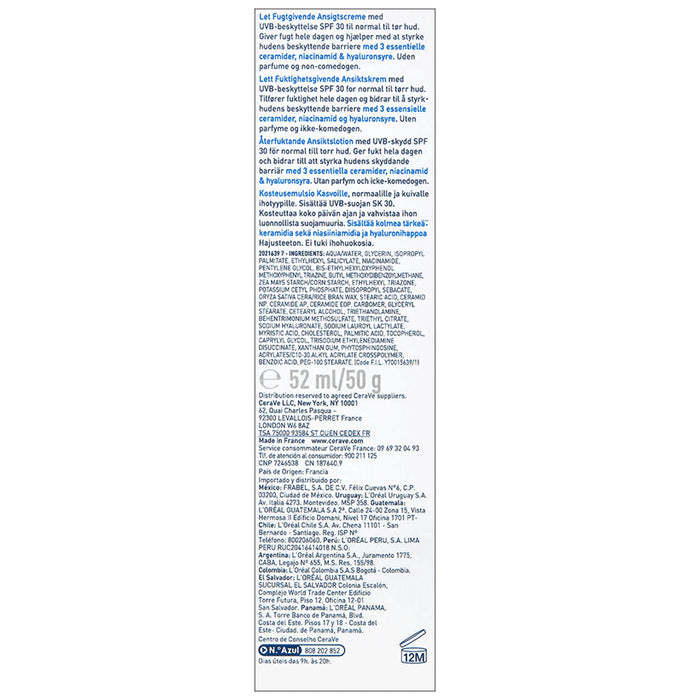 Composition : Homosalate (10%), meradimate (5%), octinoxate (5%), octocrylene (2%), zinc oxide (6.3%), water, niacinamide, glycerin, cetearyl alcohol, behentrimonium methosulfate, dimethicone, bht, ceramide np, ceramide ap, ceramide eop, carbomer, triethoxycaprylylsilane, methylparaben, sodium lauroyl lactylate, cholesterol, aluminum starch octenylsuccinate, disodium edta, propylparaben, hydroxyethylcellulose, hydrolyzed hyaluronic acid, phytosphingosine, xanthan gum.