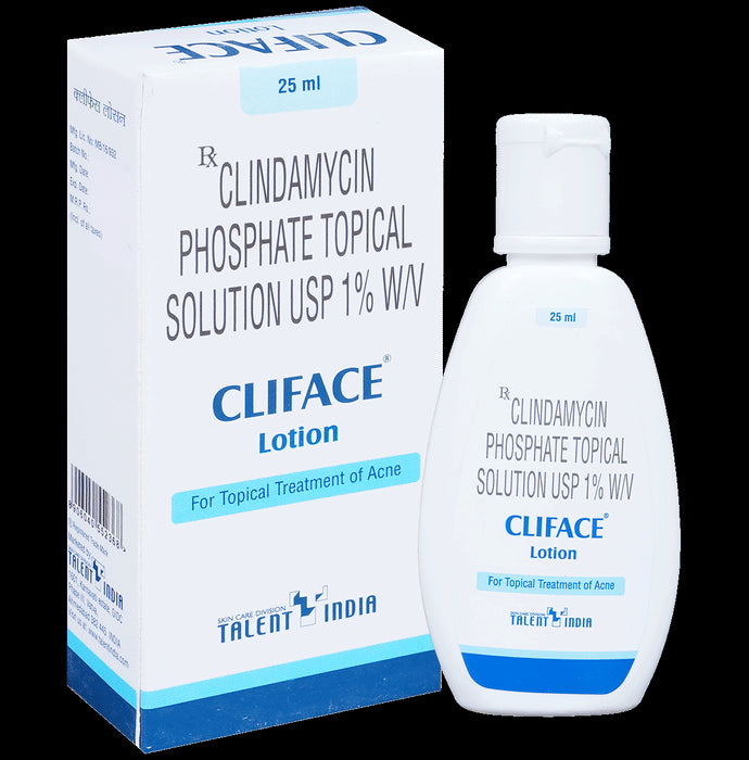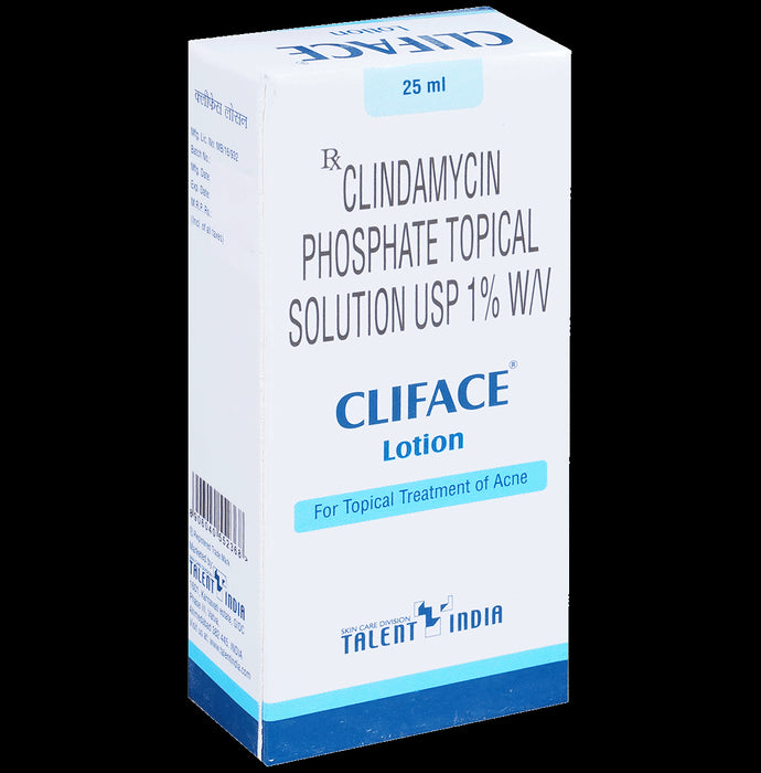 Cliface Lotion is a topical antibiotic commonly prescribed for the treatment of acne, particularly when breakouts occur on the face, chest, or back. It works by reducing the number of acne-causing bacteria on the skin, thereby minimizing inflammation and preventing the formation of new pimples. Apply Cliface Lotion in the exact dose and duration prescribed by your doctor. Make sure the skin is clean and dry. Spread a thin layer over the affected areas. Wash your hands before and after applying the medicine. Use it regularly, even if you don’t see immediate results, as it can take a few weeks to notice improvement. Avoid excessive exposure to the sun and use sunscreen, as Cliface Lotion may make your skin more sensitive to sunlight.The most common side effects of Cliface Lotion are dry skin, skin irritation, diarrhea, and gastrointestinal disturbances. These are usually mild and go away as your skin adjusts to the treatment. To reduce irritation, use a gentle moisturizer or consult your doctor if the symptoms become bothersome. If you experience severe reactions, such as a rash, swelling, or difficulty breathing, stop using it and seek medical help immediately.While using Cliface Lotion, avoid applying it to broken or irritated skin, and keep it away from your eyes, nose, and mouth. Be cautious with other acne treatments, as combining too many products can irritate the skin. If you have a history of digestive problems like colitis, let your doctor know before starting treatment, as Cliface Lotion may increase the risk of certain side effects. Pregnant or breastfeeding women should also consult their doctor before using this medicine.