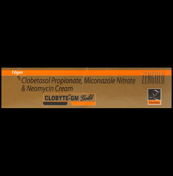 Clobyte GM Gold Cream is a combination of three medicines: Clobetasol, Miconazole and Neomycin, which treats skin infections. Clobetasol is a steroid medicine. It blocks the production of certain chemical messengers (prostaglandins) that make the skin red, swollen and itchy. Miconazole is an antifungal which stops the growth of fungi by preventing them from forming their own protective covering. Neomycin is an antibiotic. It stops bacterial growth by preventing the synthesis of essential proteins required by the bacteria to carry out vital functions.