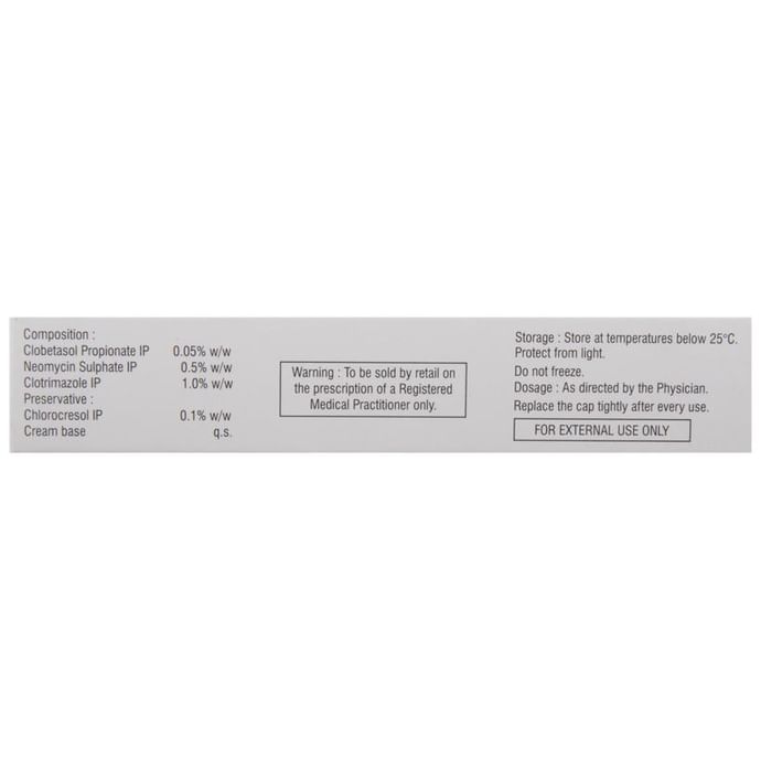 Composition : Clotrimazole (1% w/w) + Clobetasol (0.05% w/w) + Neomycin (0.5% w/w)