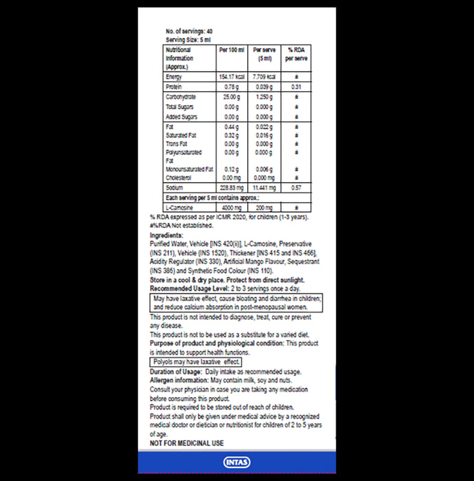Cogvin DS Syrup L-carnosine is a dipeptide having two amino acids, alanine and histidine, which is naturally found in the heart, brain, kidney, skin, and muscles that support healthy ageing and cellular rejuvenation. It promotes antioxidant activity and optimises brain and nerve cells' vitality. It may also enhance neurological function or act as a neuroprotective peptide. L-carnosine is an antioxidant that helps the body to maintain healthy protein and cellular function in various tissues.