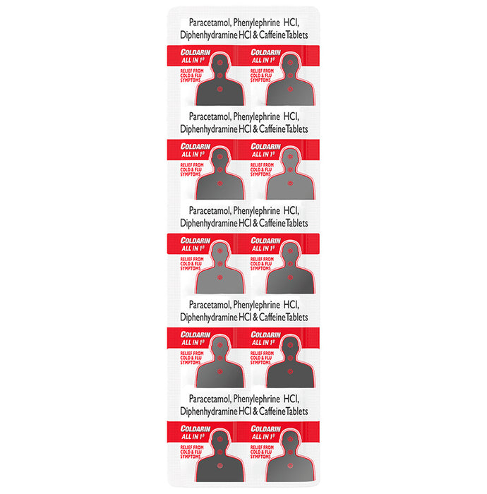 Coldarin All in 1 Tablet is used to treat common cold symptoms. It provides temporary relief from stuffiness in the nose. It also helps to relieve allergy symptoms like runny nose and watery eyes. Coldarin All in 1 Tablet is taken with or without food in a dose and duration as advised by the doctor. It is better to take it with food to avoid stomach upset. The dose you are given will depend on your condition and how you respond to the medicine. You should keep taking this medicine for as long as your doctor recommends. If you stop treatment too early your symptoms may come back and your condition may worsen. Let your doctor know about all other medications you are taking as some may affect, or be affected by this medicine.The most common side effects are nausea, vomiting, stomach pain, insomnia, restlessness, coordination impaired, and headache. Most of these are temporary and usually resolve with time. Contact your doctor straight away if you are at all concerned about any of these side effects. It can also cause dizziness and sleepiness, so do not drive or do anything that requires mental focus until you know how this medicine affects you. Avoid drinking alcohol while taking this medicine as it can make dizziness worse.Before taking it, you should tell your doctor if you have any kidney or liver diseases so that your doctor can prescribe a suitable dose for you. Also tell your doctor if you are pregnant, planning pregnancy or breastfeeding.