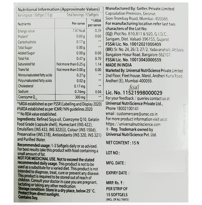 CoQ 300 Softgel is packed with Coenzyme Q10, a powerful antioxidant that shields your cells from damage caused by harmful free radicals (substances that can damage cells). These free radicals, generated during bodily processes, can lead to illness and premature aging.Coenzyme Q10 is naturally produced and present in every body cell, with its abundance in the mitochondria. Foods like meat, fish, and nuts are good sources of Coenzyme Q10. However, as we age, its levels decrease, affecting individuals with specific health conditions or on certain medications. Hence, Coenzyme Q10 supplementation becomes crucial to maintain optimal health as the food sources alone are insufficient to raise the levels within the body substantially.In varied doses, CoQ 300 Softgel promotes energy production by supporting the health of mitochondria, the cell powerhouses responsible for generating energy. It supports heart and brain health by enhancing the energy supply to the heart and brain cells, shielding them from harmful free radicals. This potent supplement also supports reproductive health by improving the quality, motility, and vitality of sperm and eggs, potentially increasing the chances of natural conception. Furthermore, it may contribute to diabetes management by improving insulin utilization by the body and protecting the pancreas from damage caused by high blood sugar.The recommended dosage is 1-3 CoQ 300 Softgels per day or as your doctor advises. It can be taken any time of the day with water. However, this supplement is best taken with a meal containing fat for faster and better absorption.Although generally well-tolerated, mild side effects like nausea, diarrhea, skin rashes, or headaches may occur. Inform your doctor about any ongoing medications, particularly blood thinners or blood pressure medications, before taking CoQ 300 Softgel, as they may interact with or alter the effects of this supplement. If you have health conditions, such as kidney or liver disease, or you consume alcohol, let your doctor know firsthand. Pregnant or breastfeeding women and those allergic to soy or any other ingredient in this supplement should consult their doctor before taking CoQ 300 Softgel.Key ingredientsActive ingredient - Co-enzyme Q10 (300mg)Other ingredients (excipients)- Refined Soya Oil, Gelatin Food Grade (Capsule Shell), Humectant, Emulsifiers, Colour, Anti-Caking Agent, Glazing Agent, Preservative, Anti-Oxidants, Purified waterKey benefitsIt is a supplement that acts as a powerful antioxidant, inhibiting free radical generation and preventing cell damage.It helps in energy production and protection from oxidative cell damage.This supplement may support healthy aging and exercise performance.It may bolster heart health, improve cognitive health, manage blood sugar levels, and support fertility.This supplement is ideal for both men and women.Direction for useThe recommended dose is one to three CoQ 300 Softgel daily, as your doctor advises. Do not exceed the recommended dosage.Take the CoQ 300 Softgel as a whole with water. Do not break or chew it. Take this supplement, preferably with a meal high in fats, to enhance its absorption.How it works?CoQ 300 Softgel works to produce energy and provide antioxidant defense against free radicals (harmful substances responsible for premature aging and illness). It helps maintain the optimum health of the mitochondria (the powerhouse of the cell) that generates adenosine triphosphate (ATP), the primary energy currency utilized by cells.Side effectsWhile CoQ 300 Softgel is usually well-tolerated, certain individuals might encounter side effects such as:Nausea DiarrheaSkin rashes HeadachesAdditionally, this supplement could interact with commonly prescribed medications; hence, it is advisable to consult with your physician beforehand.Food preferenceNon-Veg: Some ingredients used in the formulation may be derived from animal sources. Personal preference is encouraged before taking CoQ 300 Softgel.Storage and Safety InformationStore below 25 degrees Celsius at a cool and dry placeProtect from direct sunlightKeep it out of the reach of children and petsDo not consume if the capsule is leakingConsume as per the recommended dosageThis product is not intended to diagnose, treat, cure, or prevent any disease.Symptoms of Coenzyme Q10 deficiencyUsually, Coenzyme Q10 levels do not directly impact your health. However, in case of deficiency, you may experience:Fatigue and WeaknessMuscle Pain and CrampsHeart Problems include heart failure, chest pain (angina), and high blood pressure.Memory problems, difficulty concentrating, and other cognitive impairments.A weakened immune system making the body more susceptible to infections and illnesses.Gum DiseasesSeizures, developmental delays, and organ dysfunctionFrequently Asked QuestionsQ. When should I take the Coq capsule?You can take it with a meal, having a fat source either in the morning or at night.Q. What are the benefits of the CoQ300 capsule?It helps produce energy and may support healthy aging, heart health, fertility, cognitive health, and diabetes.Q. How does CoQ help in pregnancy?It may help to improve the quality, motility, vitality, and overall health of the sperm and eggs. This may increase the chances of conceiving naturally.Q. Is it safe to consume CoQ 300 Softgel every day?Yes, this health supplement is safe to be consumed every day. However, if you are pregnant, breastfeeding, or on other medications, consult your doctor first before starting this supplement.