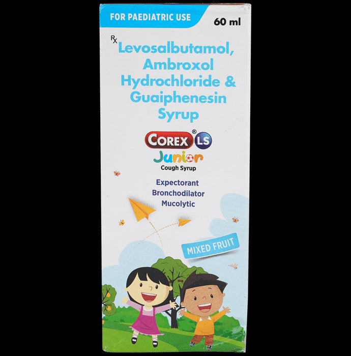 Corex LS Junior Syrup Mixed Fruit is a combination medicine used in the treatment of cough with mucus. It thins mucus in the nose, windpipe, and lungs, making it easier to cough out. It also provides relief from runny nose, sneezing, itching, and watery eyes.Corex LS Junior Syrup Mixed Fruit is taken with or without food in a dose and duration as advised by the doctor. The dose you are given will depend on your condition and how you respond to the medicine. You should keep taking this medicine for as long as your doctor recommends. If you stop treatment too early your symptoms may come back and your condition may worsen. Let your healthcare team know about all other medications you are taking as some may affect, or be affected by this medicine.The most common side effects are nausea, diarrhea, stomach pain, vomiting, muscle cramp, headache, skin rash, and increased heart rate. Most of these are temporary and usually resolve with time. Contact your doctor straight away if you are at all concerned about any of these side effects. This medicine can also cause sleepiness, so do not drive or do anything that requires mental focus until you know how this medicine affects you. Avoid drinking alcohol while taking this medicine as it can make sleepiness worse.Never support self-medication or recommend your medicine to another person. It is beneficial to have plenty of fluids while taking this medication. Before taking this medicine, you should tell your doctor if you are pregnant, planning pregnancy, or breastfeeding. You should also tell your doctor if you have any kidney or liver diseases so that your doctor can prescribe a suitable dose for you.