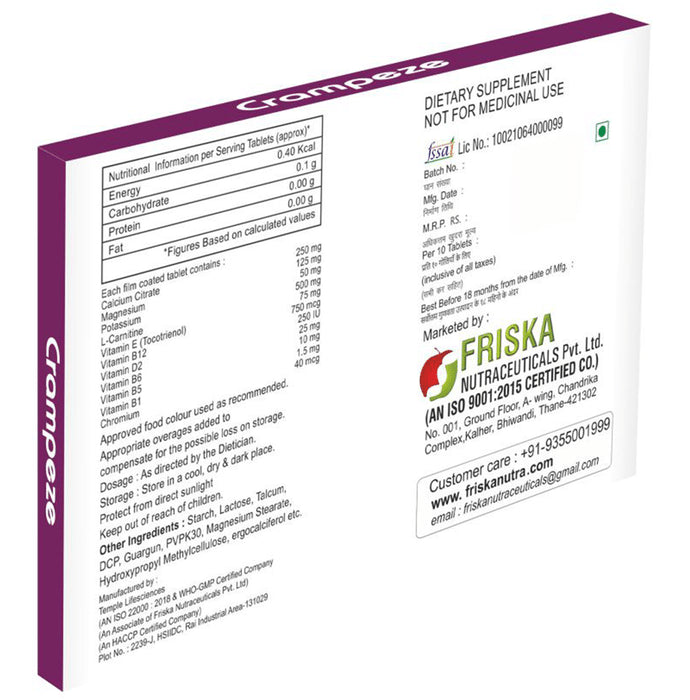 Crampeze Tablet (10 Each) is a dietary supplement enriched with calcium, magnesium, potassium, L-carnitine and multivitaminsthat might help in giving relief from cramps and muscle pains. It can reduce the blood glucose level and relieve night cramps. The tablet is suitable for vegetarians.