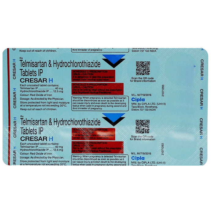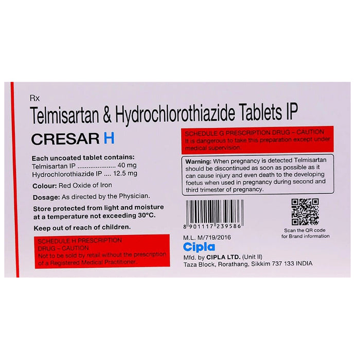 Cresar H Tablet contains two medicines, both of which help to control high blood pressure. It is generally used when one medicine alone is not controlling the blood pressure effectively. Lowering blood pressure helps to reduce your risk of having a heart attack or a stroke in the future. You can take Cresar H Tablet with or without food. The dose will depend on your condition and how you respond to the medicine. Try to take it at the same time each day. It’s important to keep taking this medicine until your doctor tells you not to. It contains a diuretic (water pill) and will make you urinate more, so it is best to avoid taking this medicine within four hours of going to bed. Use this medicine regularly even if you feel better to get the most from it. High blood pressure does not usually have symptoms and if you stop taking it your risk of heart attack or stroke may increase.The most common side effect is dizziness. Other side effects include feeling tired, nausea, shortness of breath, and changes to your heartbeat. Frequent urination is not a side effect of this medicine. It is the purpose of this medicine as frequent urination helps control your blood pressure. You may experience other possible side effects, but most are rare. Make sure you read the leaflet that comes with your medicines and tell your doctor if you are bothered by side effects or they do not go away. It may be possible to adjust your dose or try a different medicine.Do not use potassium supplements or salt substitutes unless your doctor has told you to. This medicine is not recommended during pregnancy or while breastfeeding. You should ask your doctor before taking it if you have kidney or liver disease, heart trouble or diabetes. Drinking alcohol can further lower your blood pressure and may cause side effects.