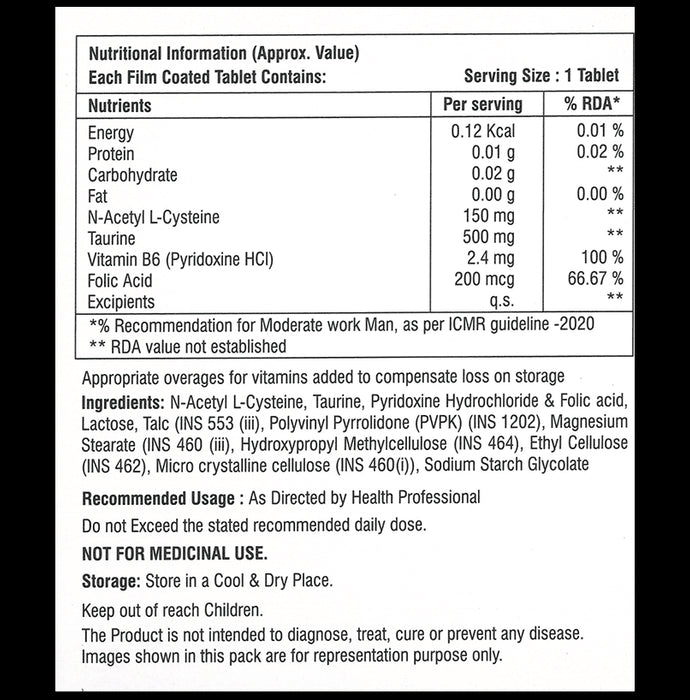 Composition : N-Acetyl L-Cysteine, Taurine, Pyridoxine Hydrochloride and Folic acid, Lactose, Talc (INS 553 (iii), Polyvinyl Pyrrolidone (PVPK) (INS 1202), Magnesium Stearate (INS 460 (iii), Hydroxypropyl Methylcellulose (INS 464), Ethyl Cellulose (INS 462), Microcrystalline Cellulose (INS 460(i)), Sodium Starch Glycolate