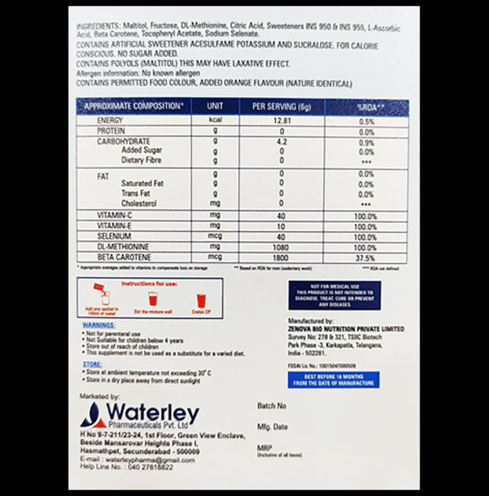 Cretox CP Sachet Orange It is a dietary supplement formulated with beta carotene, vitamin C and vitamin E that provides antioxidant support to your body. It helps produce cellular energy and serves as an antioxidant. It protects against free radicals and can reduce oxidative damage and inflammation, thus promoting heart health