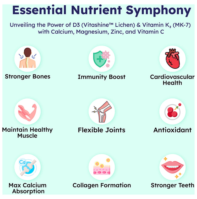Curesea Vitamin D3 & K2 (MK-7) Tablet is sourced from the renowned Vitashine™ Lichen, and K2 MK-7, harmoniously combined with Calcium, Magnesium, Zinc, and Vitamin C. This meticulously crafted supplement represents a breakthrough in comprehensive wellness, providing a multitude of benefits to support your holistic health. At the core of this dynamic formula is the plant-derived Vitamin D3, meticulously sourced from Vitashine™ Lichen. This natural origin ensures superior absorption, unlocking the full spectrum of benefits that Vitamin D3 has to offer. Partnered with Vitamin K2 MK-7, this supplement takes a stride beyond conventional formulations. Vitamin K2 plays a pivotal role in redirecting calcium, preventing its buildup in arteries, thereby supporting cardiovascular health. The synergy of these vitamins, alongside essential minerals like Calcium, Magnesium, and Zinc, fortifies bone density and strength, contributing to skeletal resilience.