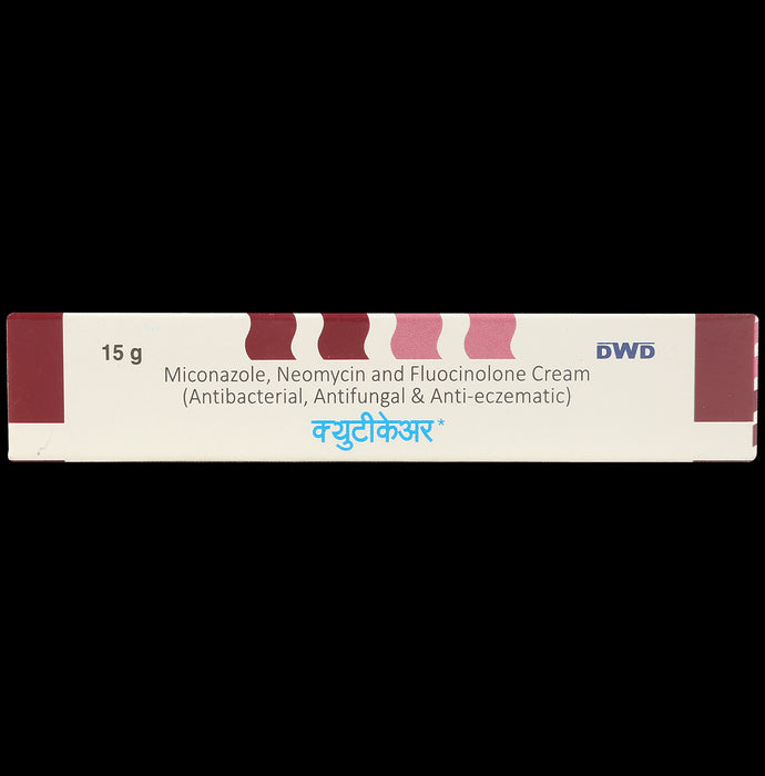 Cuticare Cream is a combination of three medicines: Fluocinolone acetonide, Miconazole and Neomycin. Fluocinolone acetonide is a steroid which blocks the production of certain chemical messengers (prostaglandins) that make the skin red, swollen and itchy. Miconazole is an antifungal which stops the growth of fungi while Neomycin antibiotic which stops bacterial growth on skin. Together, they treat your skin infection effectively.