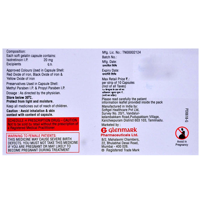 D Acne I 20 Capsule belongs to a group of medicines called retinoids (vitamin A derivative). It is used to treat severe acne that has not responded to other treatments. D Acne I 20 Capsule should be used in the dose and duration as advised by your doctor. Take it with food, preferably at the same time each day to avoid a missed dose. It may take several weeks for your symptoms to improve but keep taking the medicine regularly to get the most benefit. If you notice no improvement after a few weeks, see your doctor again.The most common side effects include dry skin, rash, and increased liver enzymes. They are not usually serious and often disappear after getting used to the medicine but if they bother you or do not go away, tell your doctor.D Acne I 20 Capsule may make you more sensitive to sunlight so you should limit your exposure to the sun. It may also make your skin more fragile. Avoid any waxing (hair removal), or laser treatments during treatment. Additionally, it may cause dryness of the mouth, lips, and eyes so drink plenty of water and use a moisturizer. This medicine may lead to birth defects, do consult your doctor if you are pregnant or planning pregnancy.