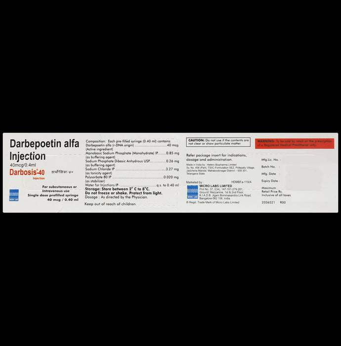 Darbosis 40 Injection is used in the treatment of anemia that may have occurred due to chronic kidney disease or chemotherapy. It works by stimulating the bone marrow to produce more red blood cells. Darbosis 40 Injection is a medicine that needs to be used with utmost care because it can lead to serious side effects. It is important that you seek treatment from a doctor who is experienced in providing this medical therapy. You should follow all the directions of the doctor strictly. It is given under the supervision of a healthcare professional.Common side effects include abdominal pain, high blood pressure, rash, injection site pain, breathlessness, cough, and peripheral edema. Inform your doctor if there are symptoms of very high blood pressure such as severe headache, problems with your eyesight, nausea, vomiting, or fits (seizures).Your doctor may get your blood tests done regularly to monitor the levels of salts (electrolytes such as potassium), hemoglobin, and blood cells in your blood. You should stop taking it and consult with a doctor if you develop shortness of breath or skin rash.Before taking Darbosis 40 Injection, tell your doctor if you have heart disease, high blood pressure, or have had a seizure or stroke. If you are pregnant or breastfeeding, or plan to become pregnant or breastfeed, consult your doctor to make sure it is safe for you.