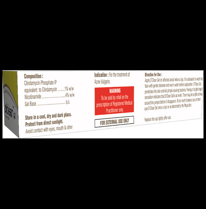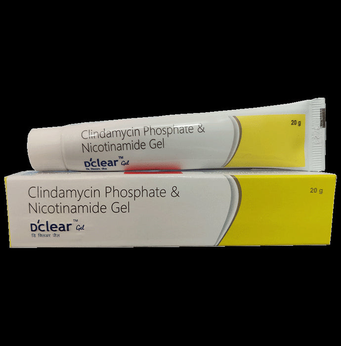 D'Clear Gel is a combination of two medicines: Clindamycin and Nicotinamide, which treats pimples (acne). Clindamycin is an antibiotic which works by penetrating into the skin and killing acne-causing bacteria. Nicotinamide is a form of vitamin B. It exerts anti-inflammatory effects when applied to the skin and reduces swelling, redness and tenderness associated with acne.