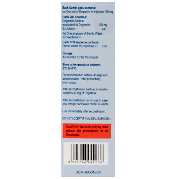 Degapride 120mg Injection is used in the treatment of advanced prostate cancer. It works by lowering the amount of testosterone produced in the body and restricts the growth of a cancer cell. Degapride 120mg Injection is given as an injection under the skin only under the supervision of a doctor. Do not try to self inject the medicine as it might enhance the chances of an accident or get injected into the veins. The dose and how often you take it depends on what you are taking it for. Your doctor will decide how much you need to improve your symptoms. You should take this medicine for as long as it is prescribed for you.The most common side effects of this medicine include Injection site reactions (pain, swelling, redness), weight gain, hot flashes, increased liver enzyme, and low sexual desire. If these bother you or appear serious, let your doctor know. There may be ways of reducing or preventing them. If you notice dizziness or trouble sleeping, then better to avoid driving or machinery work.Before taking this medicine, tell your doctor if you have ever had heart disease, or diabetes or liver disease. Your doctor should also know about all other medicines you are taking as many of these may make this medicine less effective or change the way it works. Tell your doctor if you are pregnant or breastfeeding. Your doctor may check for prostate specific antigen (PSA) level in your blood, to know treatment is working or not.