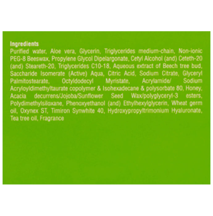 Composition : Purified Water, Aloe Vera, Glycerin, Triglycerides Medium-Chain, Non-Ionic Peg-8 Beeswax, Propylene Glycol Dipelargonate, Cetyl Alcohol (And) Ceteth-20 (And) Steareth-20, Triglycerides C10-18, Aqueous Extract Of Beech Tree Bud, Saccharide Isomerate (Active) Aqua, Citric Acid, Sodium Citrate, Glyceryl Palmitostearate, Octyldodecyl Myristate, Acrylamide/ Sodium Acryloyldimethyltaurate Copolymer and Isohexadecane and Polysorbate 80, Honey, Acacia Decurrens/Jojoba/Sunflower Seed Wax/Polyglyceryl-3 Esters, Polydimethylsiloxane, Phenoxyethanol (And) Ethylhexylglycerin, Wheat Germ Oil, Oxynex St, Timiron Synwhite 40, Hydroxypropyltrimonium Hyaluronate, Tea Tree Oil, Fragrance