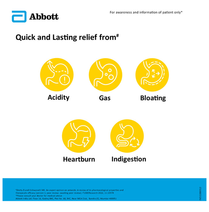 Digene Antacid Antigas Gel / For Acidity, Gas, Heartburn & Stomach Care can help provide quick relief from acidity and gas and other gas troubles like bloating and belching. The gel is formulated with Acidity Neutralising Capacity (ANC) to give quick and effective relief from acidity. It helps minimise the symptoms of acidity such as abdominal pain and stomach discomfort. It works by neutralising stomach acid. The gel has antacids like magnesium hydroxide as one of its active ingredients. It dissolves quickly in the stomach and provides quick action. It interacts with the stomach acid to produce magnesium chloride, which is absorbed by the body. Aluminium hydroxide inhibits the activity of the enzyme pepsin and alleviates heartburn.