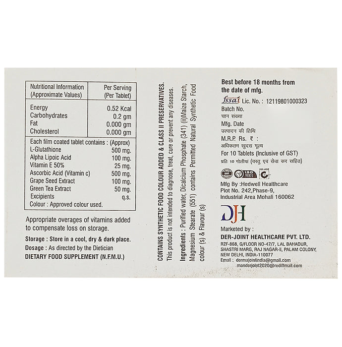 Composition : L- glutathione,Alpha lipoic acid,Vitamin E,Ascorbic acids,Green tea extracts,Grape seeds extracts