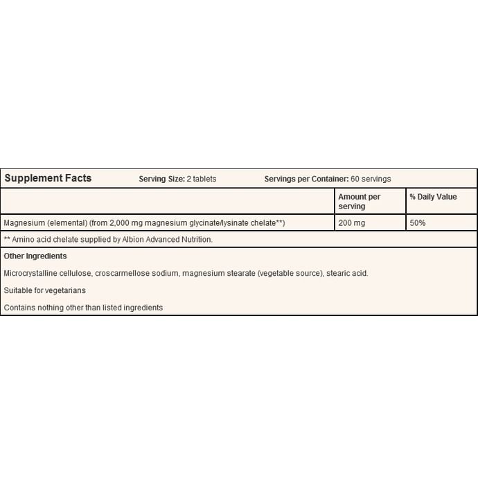 Composition : Magnesium (from 2,000 mg magnesium lysinate glycinate chelate), Microcrystalline cellulose, croscarmellose sodium, magnesium stearate (vegetable source), stearic acid, hypromellose and hydroxypropyl cellulose (coating)