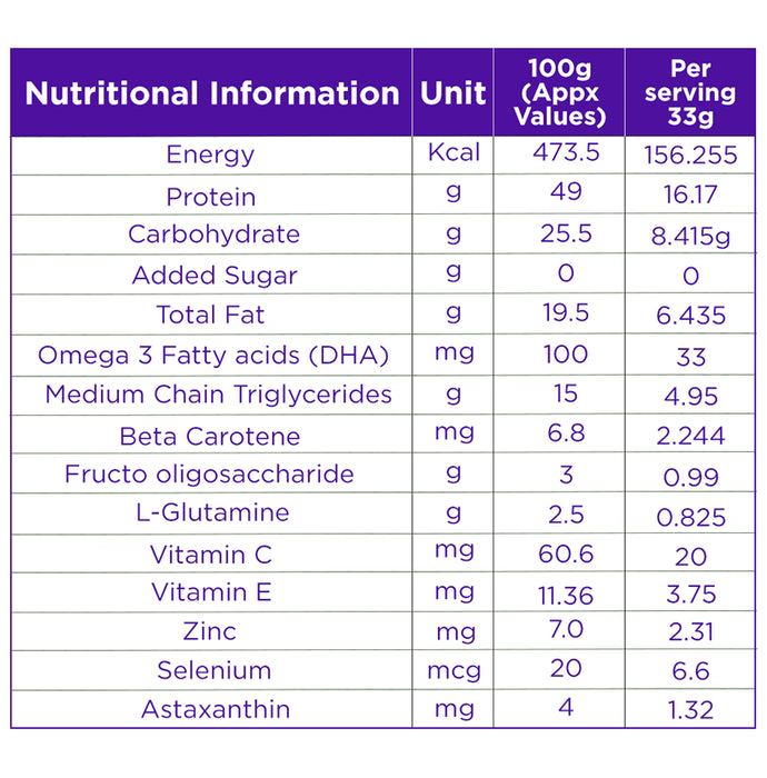 Composition : Protein, Omega 3-Fatty Acid (DHA) Medium Chain Triglycerides, Astaxanthin, Beta Carotene, Fructo Oligosaccharide, L-Glutamine, Vitamin C, Vitamin E, Zinc, Selenium