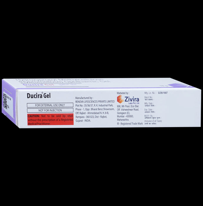Ducira Gel is a combination of medicines that is used to treat dry eyes. It relieves the symptoms of dry eyes such as pain, discomfort and irritation. It also provides lubrication to the eyes and helps in maintaining the moisture of the eyes.Ducira Gel is to be used only in the affected eye in the dose and duration as advised by the doctor. Wash your hands before using this medicine. It is advised to check the label for directions before use. Do not skip any doses and finish the full course of treatment even if you feel better. Stopping the medicine too early may lead to the infection returning or worsening.The most common side effects include blurring of vision at the application site. If this side effect persists for a longer duration, inform your doctor. In case by accident, this medicine goes into your ears, nose or mouth, immediately rinse it with water.Inform your doctor if you are pregnant or breastfeeding or are allergic to this medicine or taking any other medication. It is advised not to drive or operate heavy machinery after use of this medicine as it may cause blurring of vision and may affect your ability to drive.