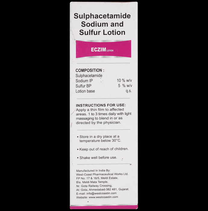 Eczim Lotion is a combination of two medicines: Sulphur and Sulphacetamide which treat acne. Sulphur is a keratolytic medicine which works by removing the top layer of dead skin. Sulphacetamide is an antibiotic. It stops bacteria from producing folic acid, a vitamin required for bacterial multiplication.