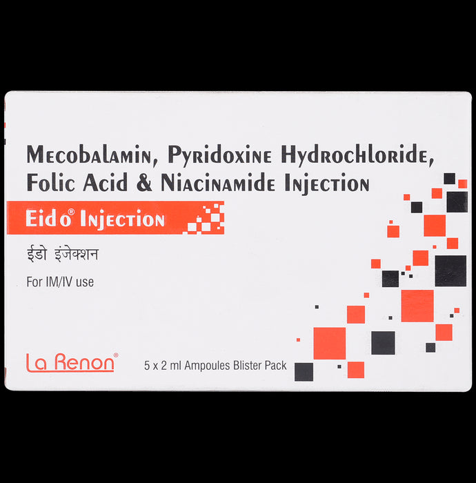 Eido Injection is a prescription medicine. It has a combination of vitamins that is prescribed to treat vitamin and other nutritional deficiencies. It ensures the proper growth and functioning of the body. Eido Injection injection is administered under the supervision of a healthcare professional. You are not advised to self administer this injection. Inform your doctor if you have any known allergy from this medication.You may experience symptoms of injection site reactions such as redness, swelling and pain. Usually they go away with time but if these symptoms persist for a longer duration, please consult your doctor. Inform your doctor if you are suffering from any disease or are taking any medicines.