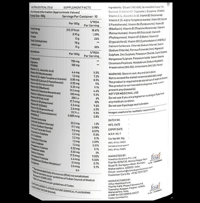Elated Sports Science Insane Mass Gainer is a potent formula designed to facilitate healthy weight management by promoting the development of lean muscle mass and increased strength. This advanced formulation is enriched with key ingredients such as glutamine, which supports rapid post-workout recovery, and digizyme, enhancing digestion and nutrient absorption. Achieving high-calorie intake and accessing top-quality protein weight management is made effortless with the inclusion of our ultra-premium creatine HCL performance matrix. By providing the perfect balance of protein and carbohydrates, this product aids in the development of healthy muscle mass and increased strength.