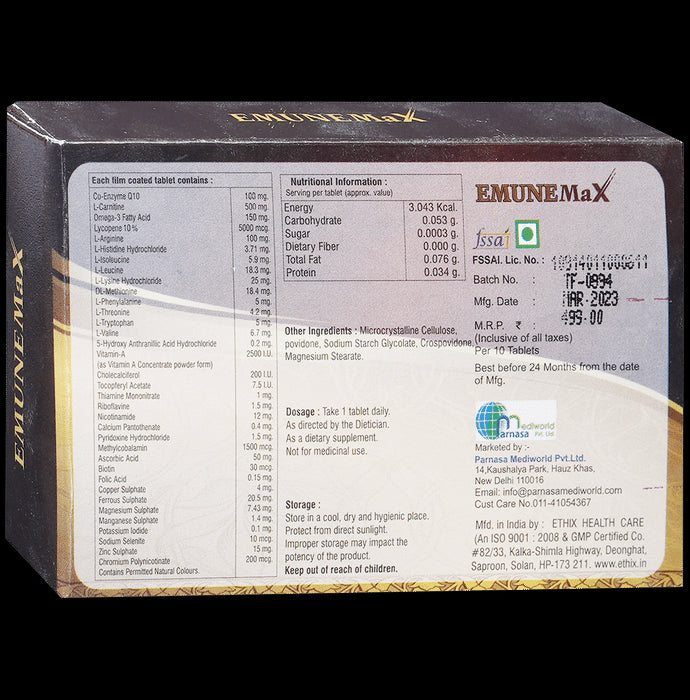Emune Max Tablet provides comprehensive immune system support with a rich array of key ingredients, including co-enzyme Q10, omega-3 fatty acid, lycopene, essential amino acids, and a broad spectrum of vitamins and minerals. This supplement offers antioxidant protection against oxidative stress, helps ensure essential nutrient supplementation for overall well-being, and supports energy metabolism and the nervous system with B vitamins. It contributes to bone health, vitamin D synthesis, and metabolic balance.