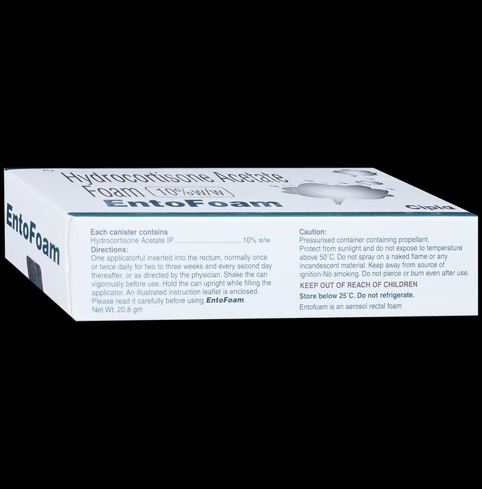 Entofoam Foam is a topical steroid used for treatment of mild to moderate inflammatory skin disorders such as eczema. It prevents the release of substances that cause inflammation and provides relief from swelling, redness, and itching in the affected area. Entofoam Foam is meant only for external use and should be used as advised by your doctor. You should normally clean and dry the affected area before applying a thin layer of the medicine evenly on the affected skin. You should not apply it on open wounds or damaged skin.Use it regularly to get the maximum benefit from it. Avoid any contact with your eyes, nose, or mouth. Rinse it off with plenty of water in case of accidental contact. Avoid covering the treated area with airtight dressings such as bandages unless directed by a doctor.It is usually well tolerated with little or no side effects. However it may cause application site reactions such as burning, irritation, itching, and redness in some people. These side effects are temporary and usually go away with time. However, if they persist or worsen, let your doctor know. It is important for pregnant and breastfeeding mothers to consult their doctors before using this medicine.