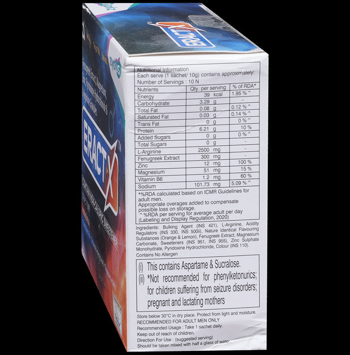 Eract-X Sachet contains the amino acid L-arginine as its active ingredient which plays an essential role in several pathways, including the synthesis of proteins and the production of creatine phosphate. It is needed to produce ATP and helps synthesise nitric oxide. It increases vasodilation and promotes immune function.