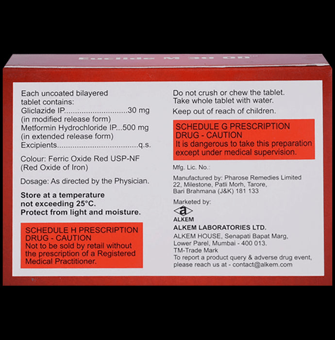 Euclide M 30 OD Tablet ER belongs to a category of medicines known as anti-diabetic drugs. It is a combination of two medicines used to treat type 2 diabetes mellitus in adults. It helps control blood sugar levels in people with diabetes. Euclide M 30 OD Tablet ER should be taken with food. Take it regularly at the same time each day to get the most benefit. Your doctor will decide what dose is best for you and this may change from time to time according to how it is working according to your blood sugar levels.Keep taking this medicine, even if you feel well or your blood sugar levels are controlled. If you stop it without consulting your doctor, your blood sugar levels could rise and put you at risk of kidney damage, blindness, nerve problems and loss of limbs. Remember that it is only part of a treatment program that should also include a healthy diet, regular exercise, and weight reduction as advised by your doctor. Your lifestyle plays a big part in controlling diabetes.The most common side effect of Euclide M 30 OD Tablet ER are low blood glucose levels (hypoglycemia), constipation, and vomiting. Make sure you recognize the signs of having low blood glucose levels, such as sweating, dizziness, headache, and shaking and know how to deal with it. To prevent this, it's important to have regular meals and always carry a fast-acting source of glucose such as sugary food or fruit juice with you. Drinking alcohol can also increase your risk of low blood sugar levels and should be avoided. Other side effects that may be seen on taking this medicine include taste changes, nausea, diarrhea, stomach pain, headache, and upper respiratory tract infection. Some people may find that they put on weight with this medicine.You should not take it if you have type 1 diabetes mellitus, if you have diabetic ketoacidosis (high levels of acid in your blood), or if you have severe kidney or liver disease. Before taking this medicine, tell your doctor if you have ever had heart disease. It may not be suitable. Pregnant or breastfeeding women should also consult their doctor before taking it. Your blood sugar levels should be checked regularly and your doctor may also advise blood tests to monitor your blood cell counts and liver function.
