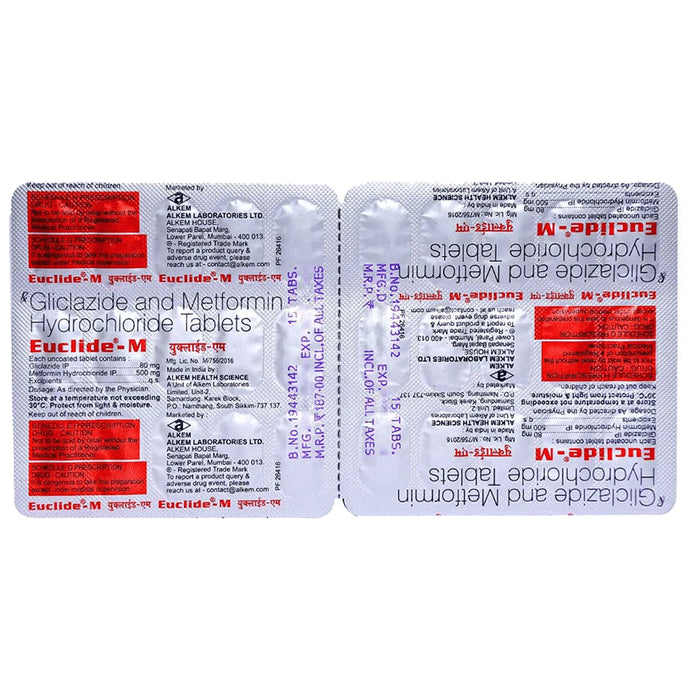 Euclide M Tablet belongs to a category of medicines known as anti-diabetic drugs. It is a combination of two medicines used to treat type 2 diabetes mellitus in adults. It helps control blood sugar levels in people with diabetes. Euclide M Tablet should be taken with food. Take it regularly at the same time each day to get the most benefit. Your doctor will decide what dose is best for you and this may change from time to time according to how it is working according to your blood sugar levels.Keep taking this medicine, even if you feel well or your blood sugar levels are controlled. If you stop it without consulting your doctor, your blood sugar levels could rise and put you at risk of kidney damage, blindness, nerve problems and loss of limbs. Remember that it is only part of a treatment program that should also include a healthy diet, regular exercise, and weight reduction as advised by your doctor. Your lifestyle plays a big part in controlling diabetes.The most common side effect of Euclide M Tablet are low blood glucose levels (hypoglycemia), constipation, and vomiting. Make sure you recognize the signs of having low blood glucose levels, such as sweating, dizziness, headache, and shaking and know how to deal with it. To prevent this, it's important to have regular meals and always carry a fast-acting source of glucose such as sugary food or fruit juice with you. Drinking alcohol can also increase your risk of low blood sugar levels and should be avoided. Other side effects that may be seen on taking this medicine include taste changes, nausea, diarrhea, stomach pain, headache, and upper respiratory tract infection. Some people may find that they put on weight with this medicine.You should not take it if you have type 1 diabetes mellitus, if you have diabetic ketoacidosis (high levels of acid in your blood), or if you have severe kidney or liver disease. Before taking this medicine, tell your doctor if you have ever had heart disease. It may not be suitable. Pregnant or breastfeeding women should also consult their doctor before taking it. Your blood sugar levels should be checked regularly and your doctor may also advise blood tests to monitor your blood cell counts and liver function.