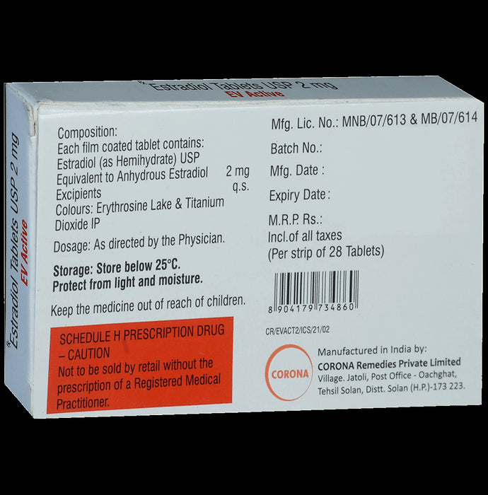 EV Active Tablet is a female sex hormone (estrogen). This is a type of hormone replacement therapy (HRT) that is used to treat symptoms associated with menopause (hot flushes, vaginal dryness, and itching), estrogen deficiency, and thinning of bones (osteoporosis). EV Active Tablet is to be swallowed with water. It can be taken with or without food, but remember to take it at a fixed time each day for better efficacy. The dose and duration will be decided by your doctor so that you get the right amount to control your symptoms. If you have missed a dose, take it as soon as you remember it. Do not skip any dose and finish the full course of treatment. The treatment should not be stopped abruptly without consulting your doctor as this may affect the potency of this medicine.The most common side effects of this HRT are headaches, breast pain, irregular vaginal bleeding or spotting, abdominal cramps or bloating, nausea, vomiting, and hair loss. Some of the warning signs and symptoms that need immediate medical attention are breast lumps, unusual vaginal bleeding, dizziness and faintness, severe headaches, chest pain, shortness of breath, pains in your legs, etc.Before taking this medicine, it is important to tell your doctor if you are taking or have recently taken any other medicines for the same disease or other diseases. Before you initiate with this HRT, you must consult the doctor if you have a history of unexplained vaginal bleeding or if you have ever had a blood clot in your legs or your lungs. If you are pregnant or breastfeeding, you should tell your doctor before taking this medicine. Your doctor may suggest you some diagnostic or laboratory tests to know the effects and side effects of this medicine on your body.