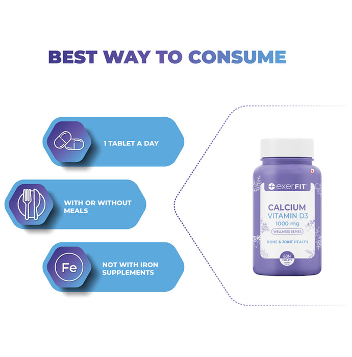 Exerfit Calcium Vitamin D3 1000mg Tablet is an advanced bone health formula. It has been carefully designed using the most bioactive form - Calcium Citrate Malate with 100% RDA for Vitamin D3 (veg) that helps in bone mineralization.It is infused with Vitamin K2-MK7, Magnesium, Selenium, Boron, Vitamin C, Vitamin E and Zinc to enhance calcium uptake by bone cells. The amino acid complex reduces the rate of bone degradation.In addition, Boswellia serrata and Moringa extract work together to reduce joint inflammation and stiffness. Enzyme Papain maintains the acid-base balance, which reduces bone loss by optimizing bone cell function.