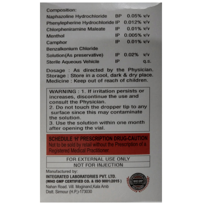Composition : Chlorpheniramine Maleate (0.01% w/v) + Camphor (0.01% w/v) + Menthol (0.005% w/v) + Phenylephrine (0.012% w/v) + Naphazoline (0.05% w/v)