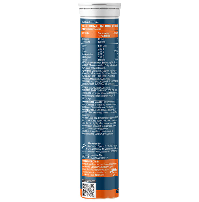 Fast&Up Melatonin Effervescent Tablet is developed with melatonin and l-theanine, which is a safe, non-habit forming and natural sleep aid. Melatonin regulates the body’s circadian rhythm and regulates hormones such as serotonin and dopamine that helps with the sleep and stress cycle. L-Theanine is known to have effects on neurotransmitter levels in the brain that has a direct influence on sleep, stress and mood swings. L-Theanine is a precursor to hormones such as serotonin and dopamine that have a calming effect and plays a vital role in the sleep-wake cycle. It is formulated with high quality and well-researched combination , which is a safe, non-habit forming and natural sleep aid.