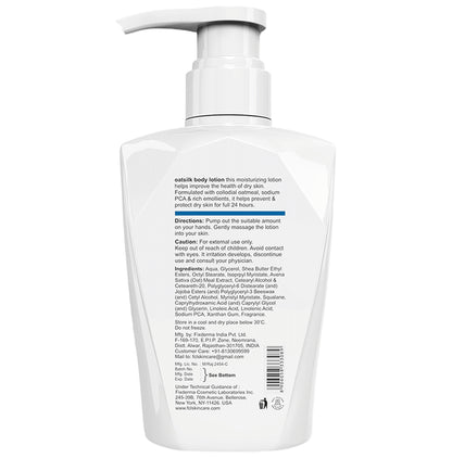 Fixderma FCL Oatsilk Body Lotion benefits the skin by nourishing it and keeping it moisturised. It contains Linoleic acid, which helps to control acne outbreaks, rebuild the skin's permeability barrier, and keep moisture locked in. It also relieves irritation, keeps skin from drying out, improves skin tone, and feels light on the skin.