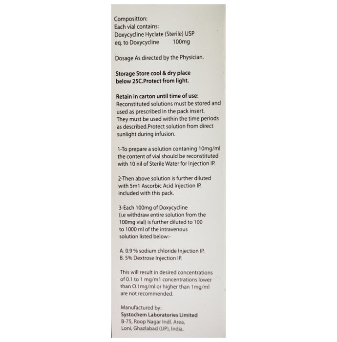 Fedradox Injection is an antibiotic medicine used to treat bacterial infections in your body. It is effective in some infections of the lungs, urinary tract, eyes, and others. It kills bacteria, which helps to improve your symptoms and cure the infection. Fedradox Injection is also used to treat many sexually transmitted diseases. It helps to improve your symptoms and cure the underlying infection. It is given as a drip (intravenous infusion) into a vein by a doctor or a nurse. You should get the injection regularly at evenly spaced intervals for maximum benefits. Do not skip any doses and finish the full course of treatment even if you feel better. Stopping the medicine too early may lead to the infection returning or worsening.The most common side effects of this medicine include skin reaction on exposure to sunlight (photosensitivity), vomiting, nausea, and diarrhea. Avoid excessive sun exposure and use sunscreen and protective clothing when outdoors. Some people may develop temporary redness or pain at the site of injection. These side effects are usually mild but let your doctor know if they bother you or last more than a few days.Before using it, you should tell your doctor if you are allergic to any antibiotics. You should also let your doctor know all other medicines you are taking as they may affect, or be affected by this medicine. Pregnant and breastfeeding mothers should consult their doctor before using it. It may blur your vision or make you feel sleepy and dizzy. Do not drive if these symptoms occur.