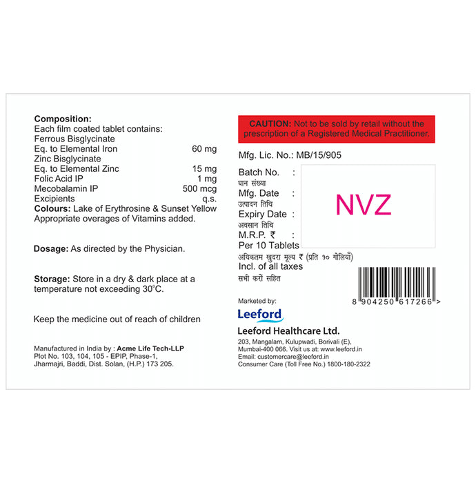 Composition : Ferrous Bisglycinate (60mg) + Zinc bisglycinate (15mg) + Folic Acid (1mg) + Methylcobalamin (500mcg)