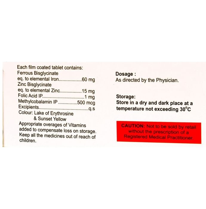 Composition : Ferrous Bisglycinate (60mg) + Zinc bisglycinate (15mg) + Folic Acid (1mg) + Methylcobalamin (500mcg)