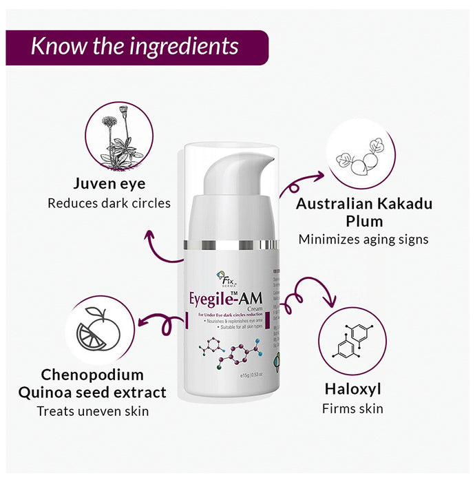 Fixderma Eyegile-PM Cream helps to reduce puffiness, redness, and inflammation around the eyes. It contains Niacinamide, which helps to keep the skin around the eyes tight. It also minimises redness, and fades dark spots. Chenopodium quinoa seed extract helps to reduce puffiness and swelling around the eyes while also maintaining the structural stability of drooping skin.