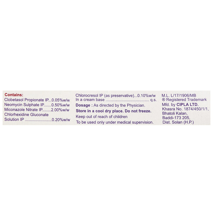 Composition : Clobetasol (0.05% w/w) + Neomycin (0.5% w/w) + Miconazole (2% w/w) + Chlorocresol (0.1% w/w)