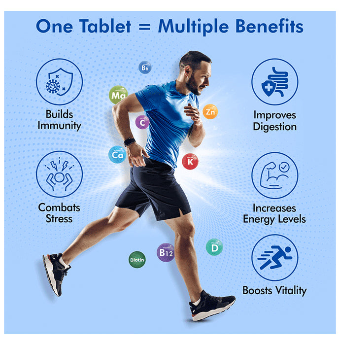 Composition : Grape Seed Extract, Ginseng Extract, Vitamin A, B, B2, B3, B5, B6, B12, C, D3 And E, Folic Acid, Biotin, Chromium Picolinate, Ashwagandha, Lactic Acid Bacillus, Ferrous Fumarate, Zinc Sulphate Monohydrate, Magnesium Oxide, Manganese Sulphate Sodium Lodate, Copper Sulphate, Sodium Selenate, Chromium Rocknate, Microcrystalline Cellulose, Starch, Colloidal Silicon Dioxide, Ethyl Cellulose Hydroxy Propyl Cellulose, Magnesium Stearate, Talc, Contains Permitted Class II Preservative